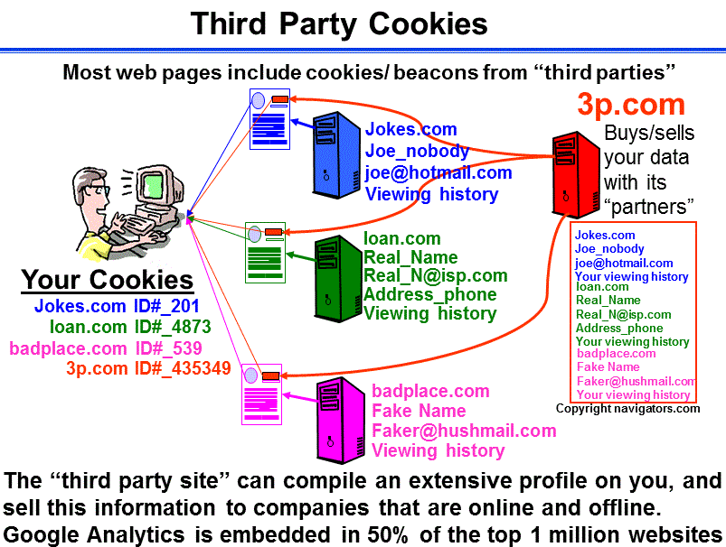 The greatest concern with cookies is when they come from third party web sites. For example, an advertising company may handle the advertising banners you see displayed on thousands of different web sites. As you visit a web page, the advertisement banner (And its own cookie) may be downloaded from the ad_company's server. It is possible for a major company such as Doubleclick/Google to develop an extremely detailed profile of your web surfing patterns including which sites you have visited, what key words have you searched for, etc.